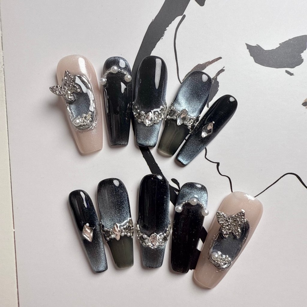 本店穿戴甲是純手工製造,手工定制更符合你的尺寸,一副10片,光療製造,甲片可重複使用。